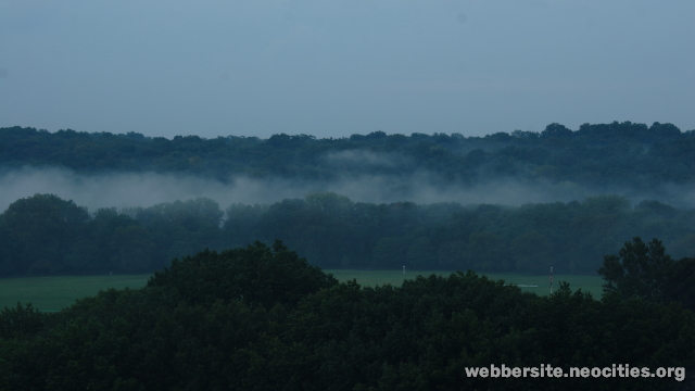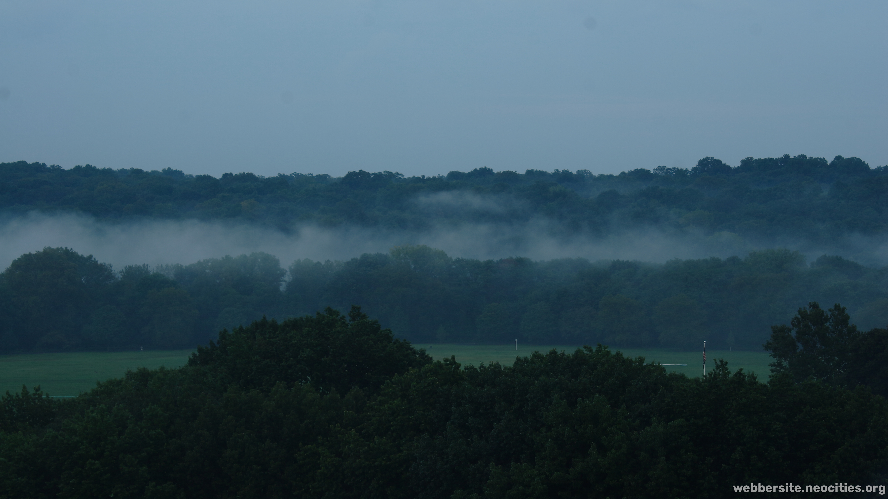 A photo of a cloud of mist slowly creeping between the trees in Van Courtlandt Park, located in the northern part of the Bronx, New York City.