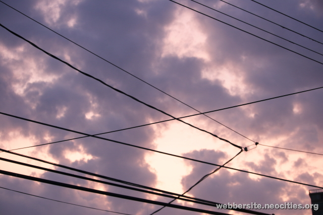 A photo of hazy purple clouds during sunset, framed by criss-crossing power lines.