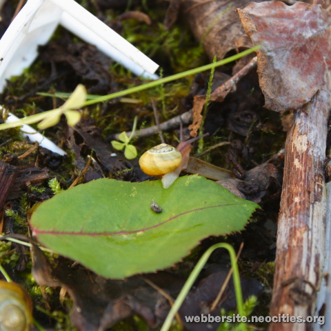 A photo of a small snail moving across the ground next to one of those pizza seperators.